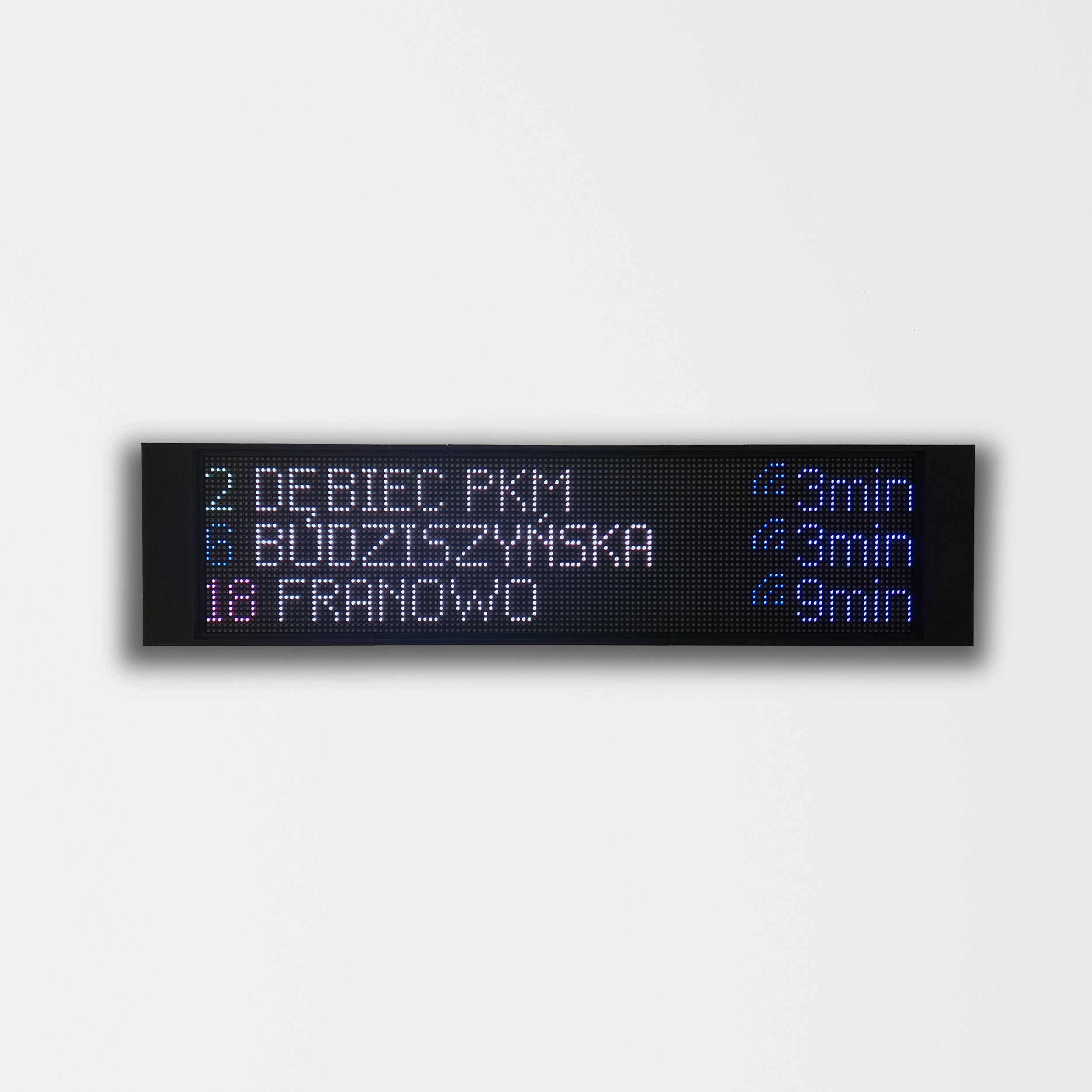 Wyświetlacz LED Kiedy Wjazd pokazuje w czasie rzeczywistym aktualne czasy odjazdów komunikacji miejskiej z wybranych przystanków. W cenie urządzenia zawarta jest roczna subskrypcja usługi Kiedy Wjazd umożliwiająca dostęp do aktualnych danych.